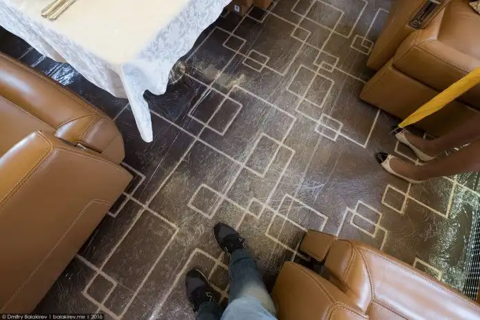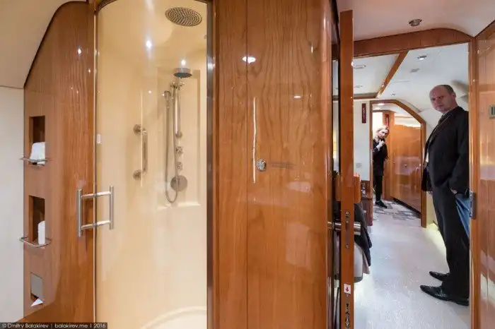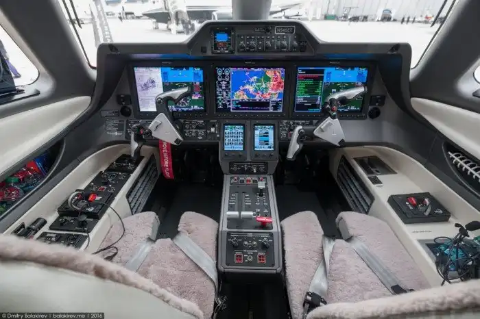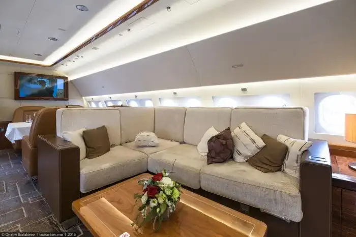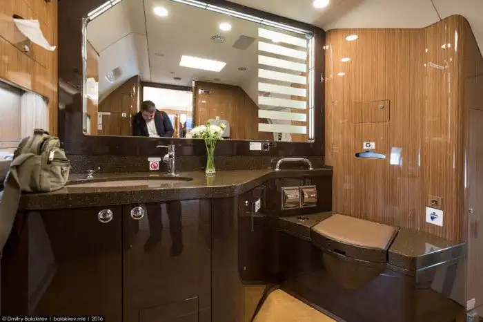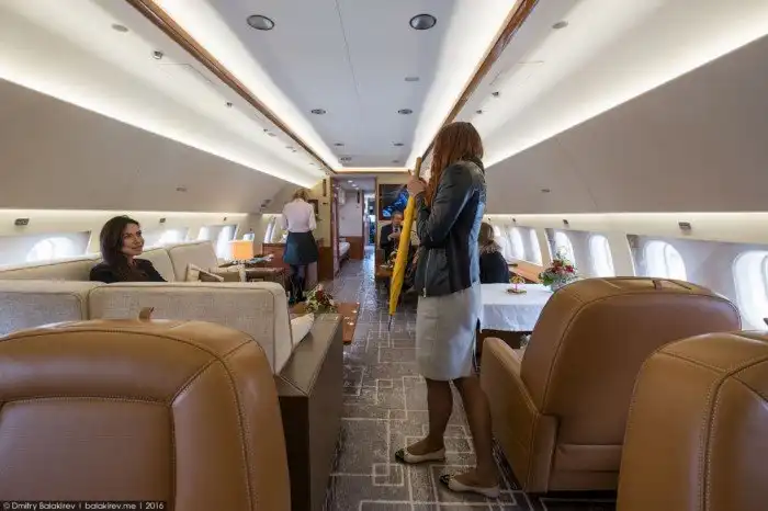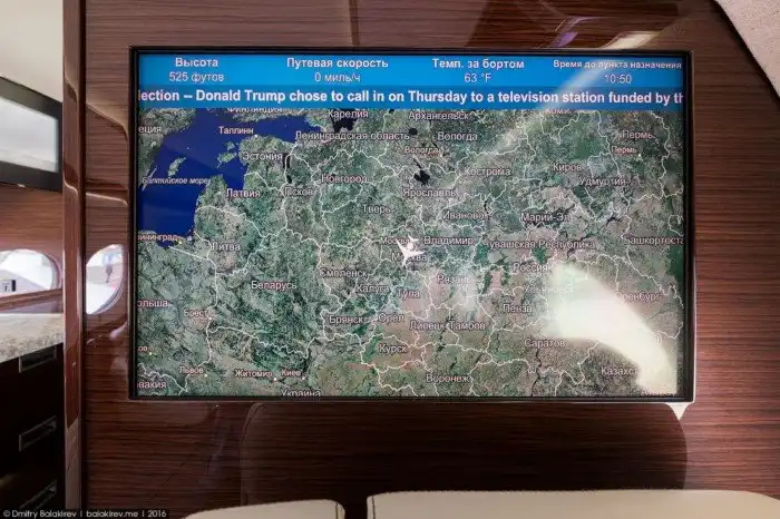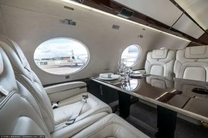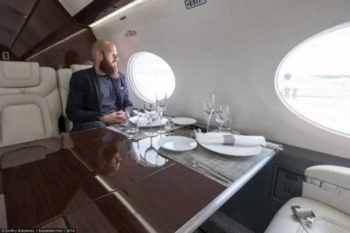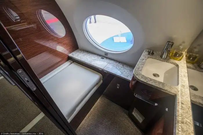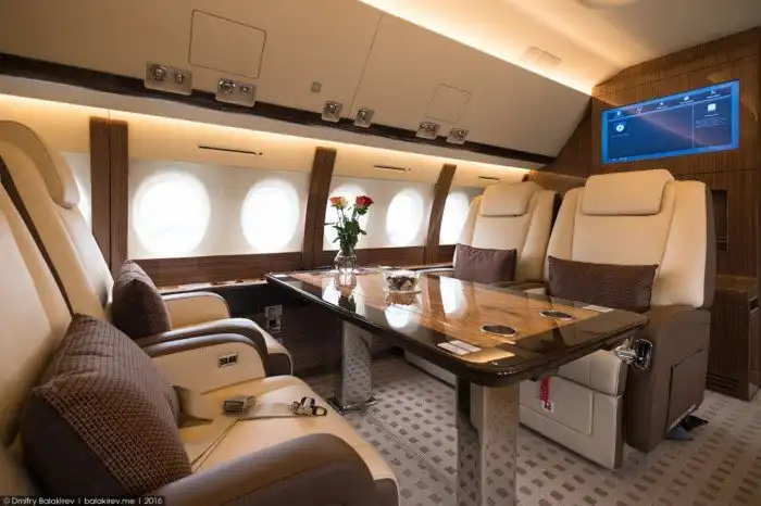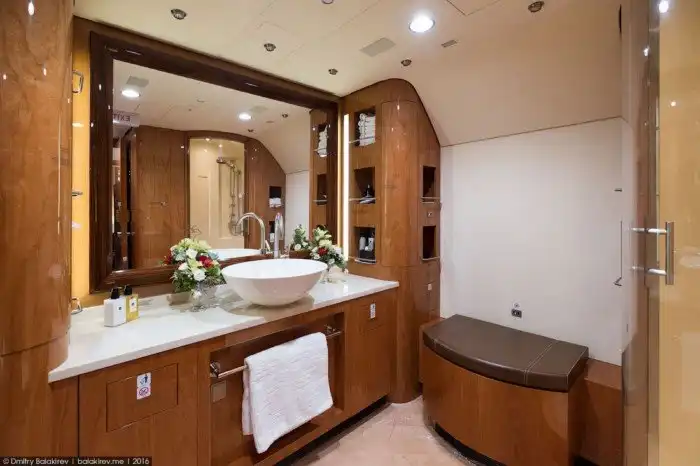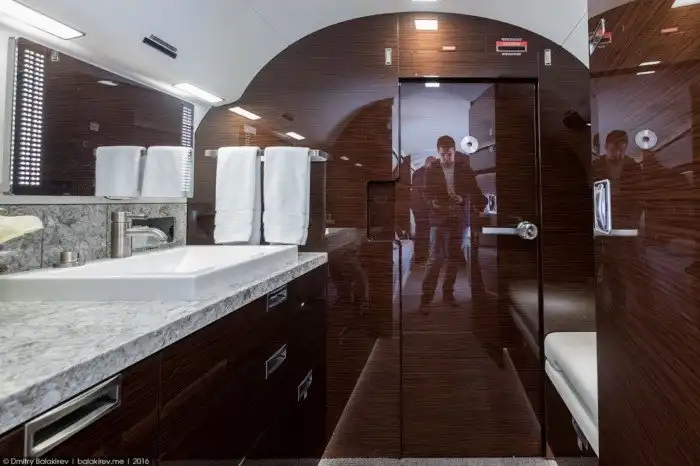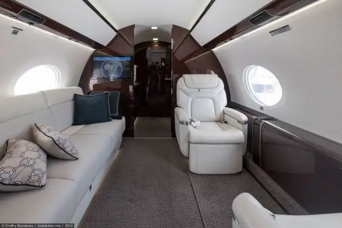 Компоновка типичная для бизнес-джетов. Широкие кресла, столики, диваны. С дизайном самолета все происходит следующим образом. В авиастроительную компанию приходит клиент с большими деньгами. Продавец предлагает несколько десятков вариантов компоновки салона. А дальше включаются «хотелки» человека, готового выложить за лайнер под 100 миллионов долларов. Он хочет, чтобы ковер был не серый, а зеленый. Просит сделать душ просторнее, повесить в салоне особенную плазменную панель и т.д. Поэтому «внутренности» самолета могут меняться в зависимости от идей заказчика.