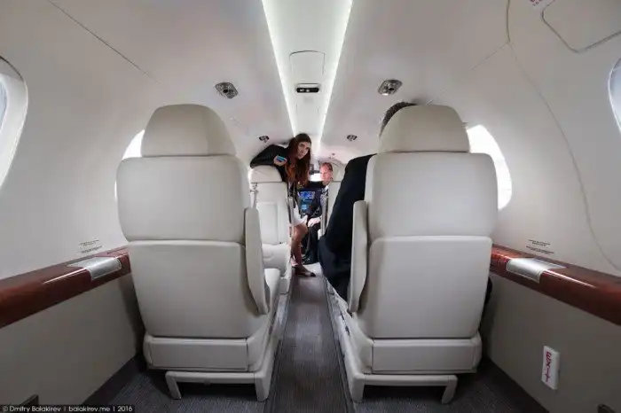Салон полностью отвечает требованиям времени. Красивая отделка, мягкие кресла, приятная расцветка. Понятно, что самолет уступает размерами конкурентам из Airbus и Boeing. Зато на фоне стандартных бизнес-джетов лайнер выглядит настоящим гигантом.