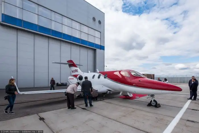 Симпатичный джет от Хонды, который впервые представили в Москве. Интересно, что двигатели самолета прикреплены не к корпусу, а к крыльям. Птичка летает на расстояние 2200 км и стоит 4,5 миллиона долларов: