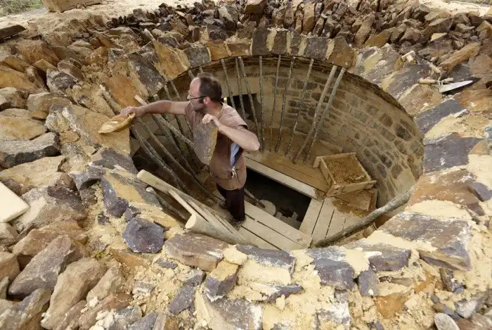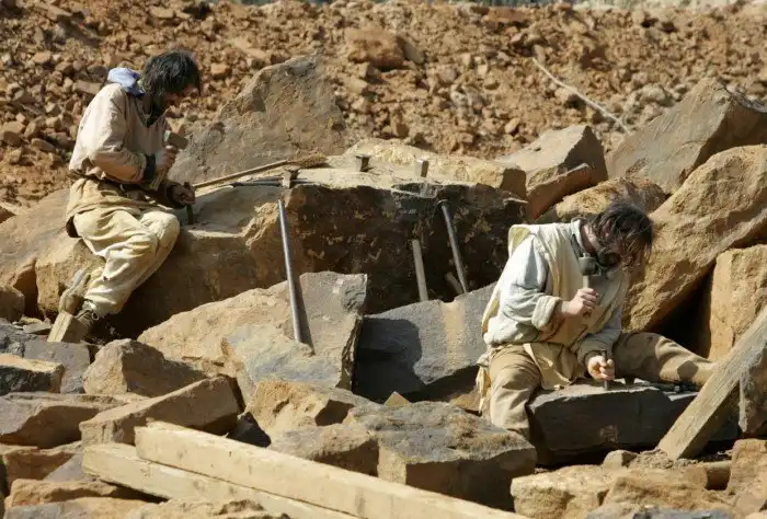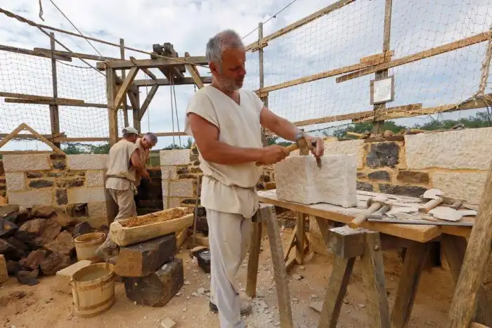 Проект возведения замка Геделон позволит изучить многие технологии средневековых мастеров. Одной из самых трудных задач было возрождение технологий добычи камня. Инструменты, кстати, тоже самодельные, а не из Леура, 25 июня 2005. (Фото Jacky Naegelen | Reuters):