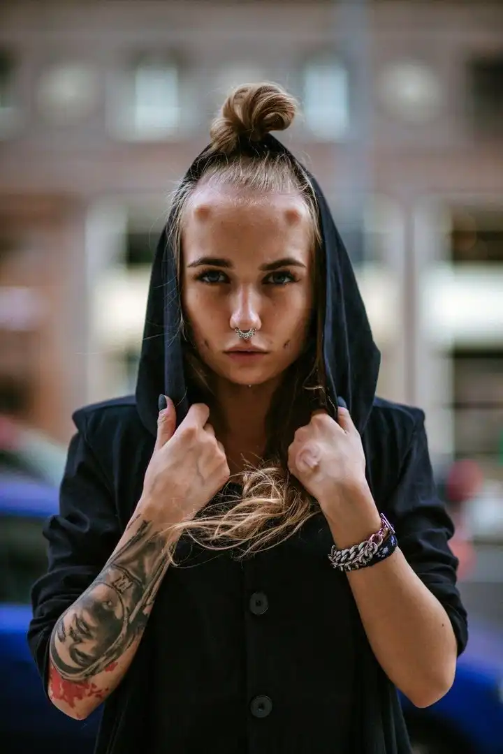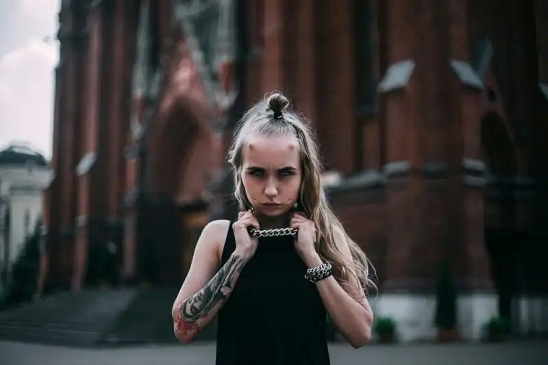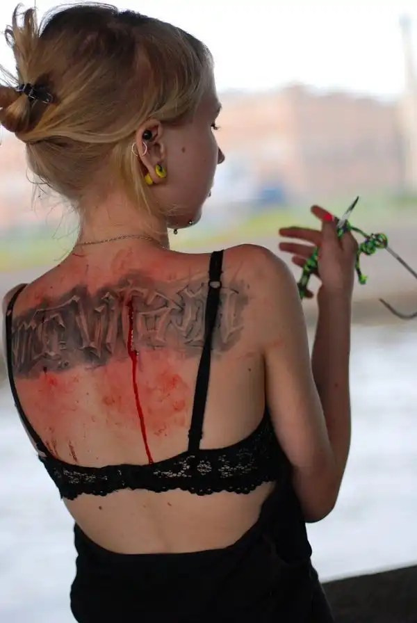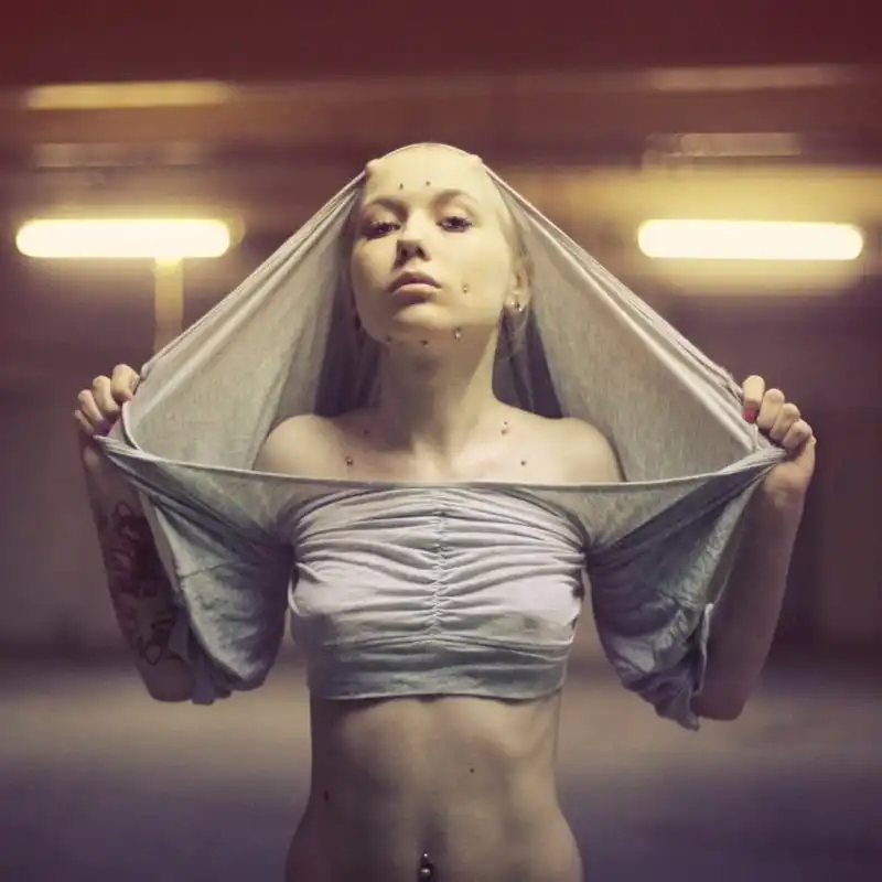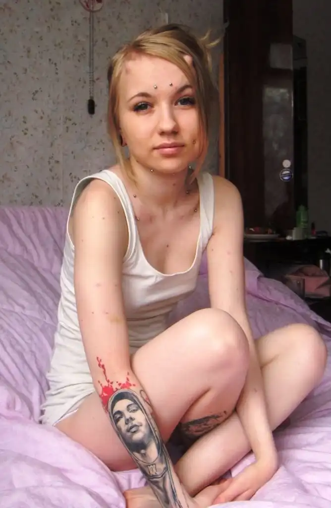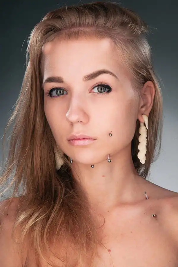 Екатерина Шальная - 27-летняя модель из Санкт-Петербурга, отличающаяся от своих более гламурных коллег наличием массивных татуировок, экстремального пирсинга и прочих модификаций тела. Глядя на нее, у меня возникают довольно противоречивые чувства: вроде симпатичная, но жутковатая с другой стороны.