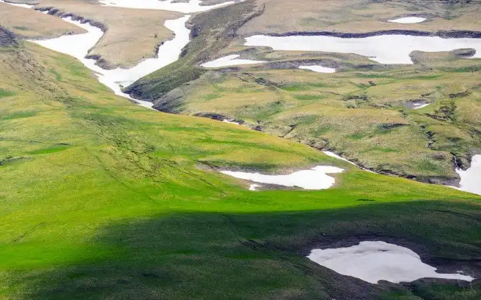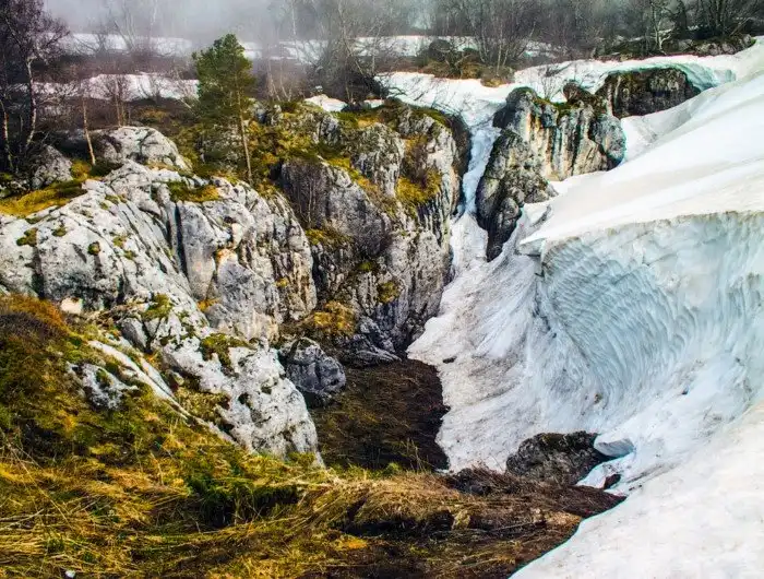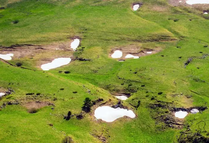Отверстия в земле — карстовые провалы, некоторые находятся под снегом и потом могут заполниться водой, образовав озерца: