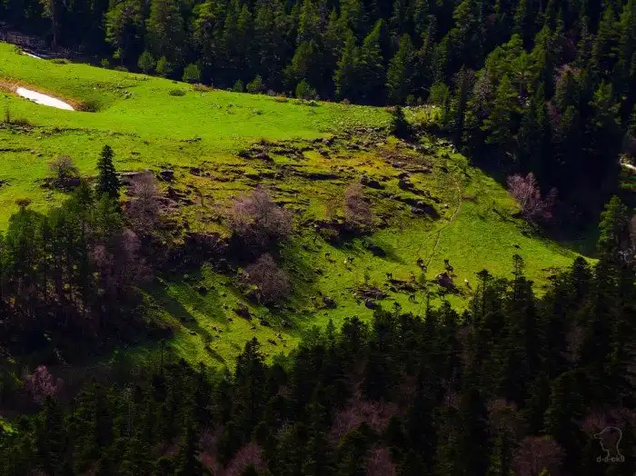 Плато Лаго-Наки является истоком реки Курджипс (и не только). Ее извилистый путь сразу виден по произрастающим вдоль русла деревьям: