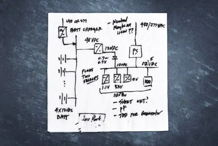 «Дата-центр огромен, но идея его создания родилась на обратной стороне этой салфетки. Однажды ночью, инженер Джей Парк так набросал свое видение системы.»