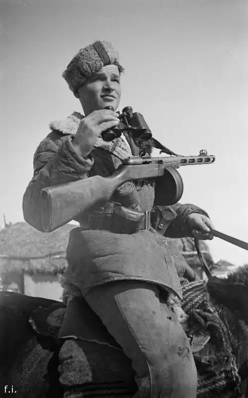 Портрет советского партизана с ППШ и биноклем на коне. 1943 год. Фото Семена Фридлянда.