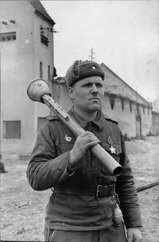 Гвардии старший сержант Илья Амелин из 15-й гвардейской стрелковой дивизии с трофейным немецким гранатометом «Панцерфауст». 1-й Украинский фронт. 1945 год.