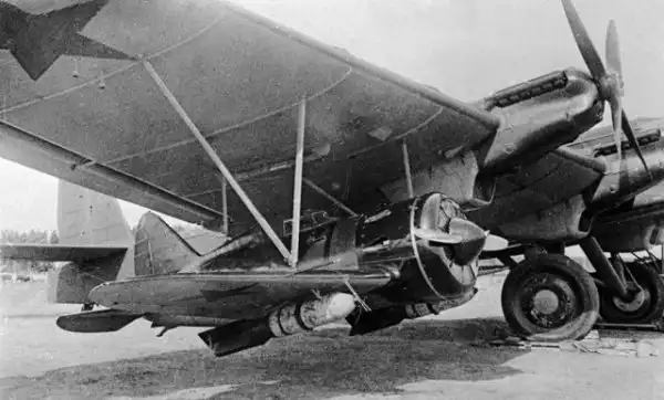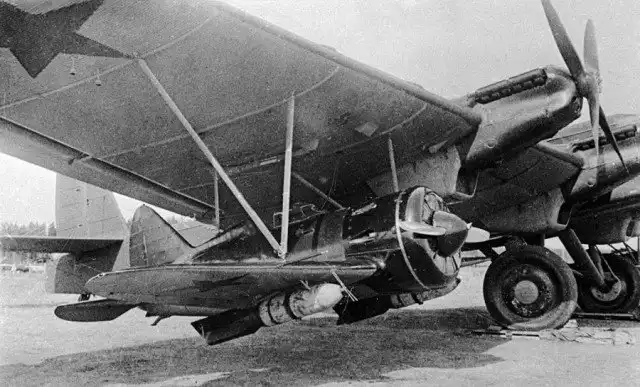 Под крылом самолета ТБ-3 подвешен истребитель И-16 с фугасными бомбами весом 250 кг каждая. лето 1941 года.