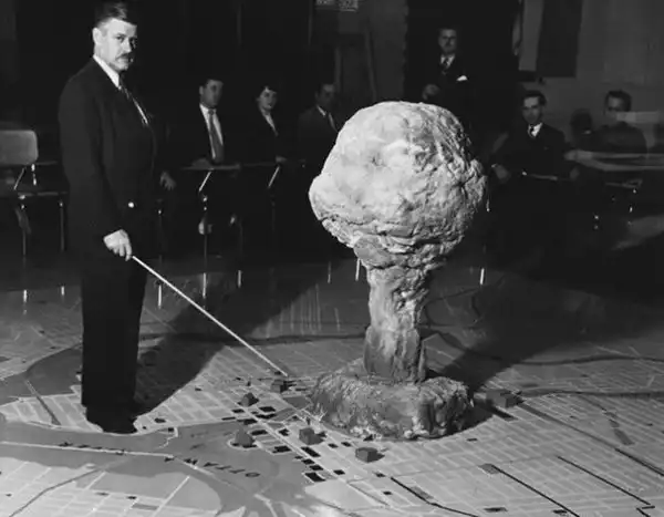 Полковник–лейтенант Артур Кротье показывает возможное воздействие ядерного взрыва на Оттаву, Канада, 26 апреля 1952 года