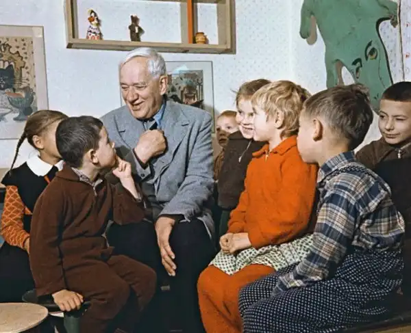 16.11.1959 Детский писатель Корней Иванович Чуковский (1882-1969) во время встречи со своими юными читателями в детской библиотеке в Переделкино