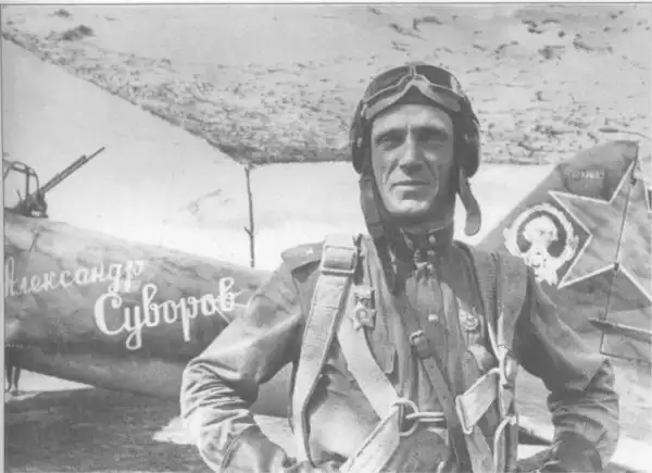 Кавалер ордена Суворова, командир 167-го гвардейского авиаполка майор Д.Л. Ломовцев на фоне своего именного штурмовика Ил-2 «Александр Суворов». Серийный номер самолета 1877653. Осень 1943 года.