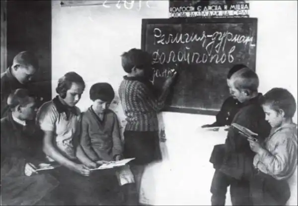 Юные члены коммуны «Соцсоревнование» готовят антирелигиозные лозунги к Пасхе, Харьковская область, 1931 год