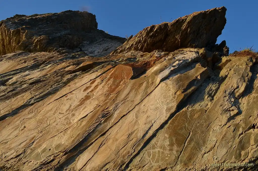Наиболее хорошо сохранился верхний ярус петроглифов. Но рассмотреть их получилось только на фотографиях. Рисунки на нижем ярусе чередуются с надписями современных "дарований".