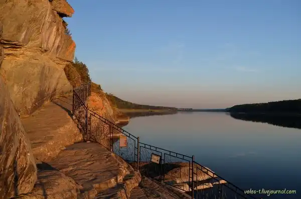С крутого яра к скальному выступу с петроглифами ведет лестница, а возле него оборудована смотровая площадка.