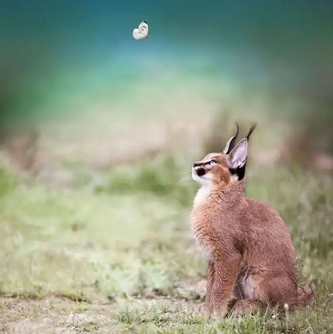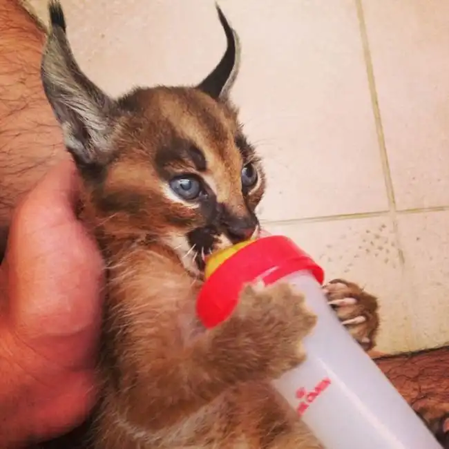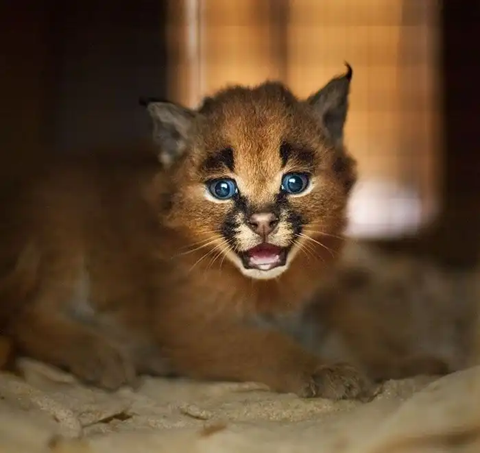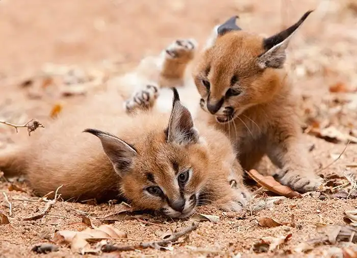 Эти очаровательные котята являются детенышами хищных кошек каракалов. Несмотря на то, что внешне каракалы похожи на более привычных нам рысей, они являются отдельным родом. Взрослые каракалы вырастают до размеров средних собак и весят 11 - 19 кг, их легко можно одомашнить, поэтому нередко эти хищники становятся экзотическими домашними животными.