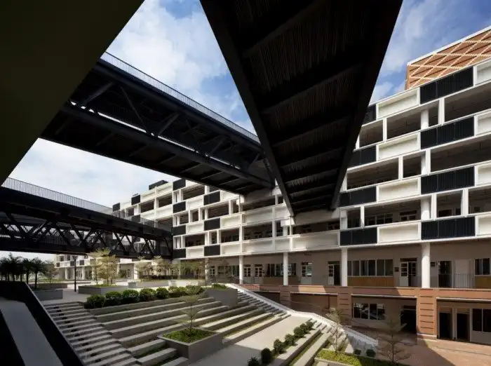 Идущие в разных направлениях мосты-коридоры отбрасывают прохладные тени на школьный двор.