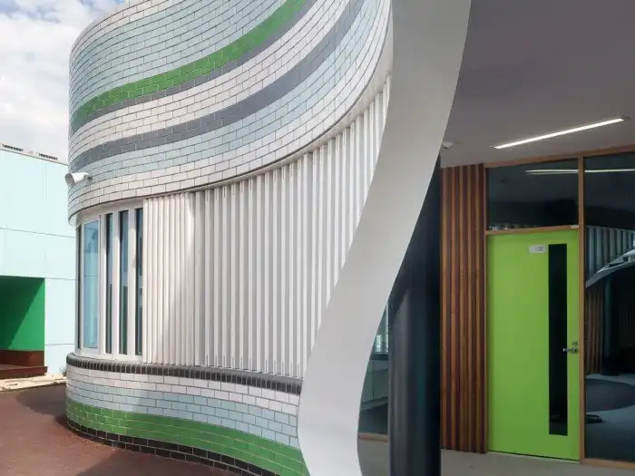 Средняя школа Пенлей и Эссендон из города Ниддри, Австралия, вся окрашена в контрастные цвета. Наклонные стены вызывают желание вступить в игру.