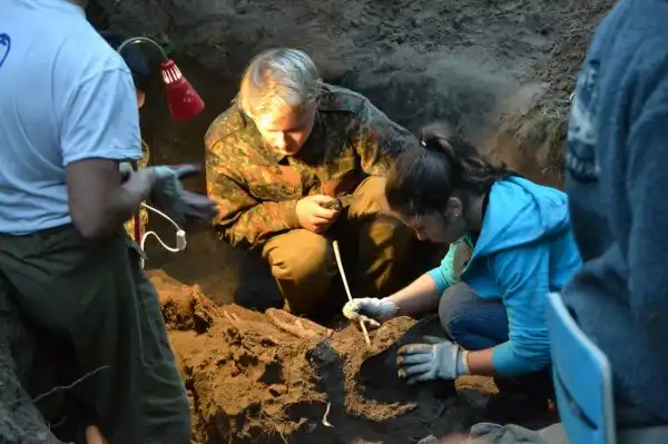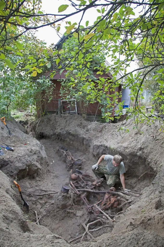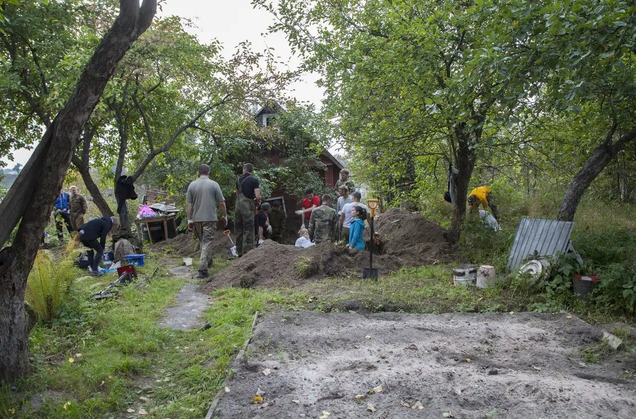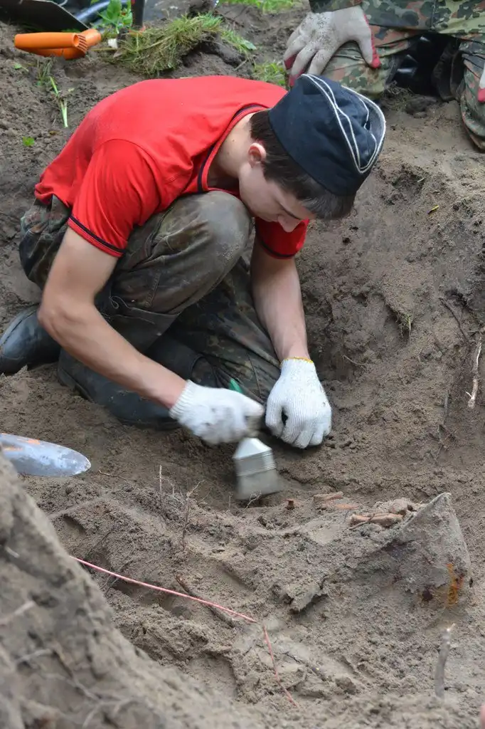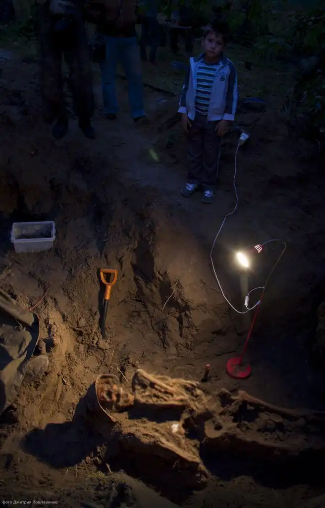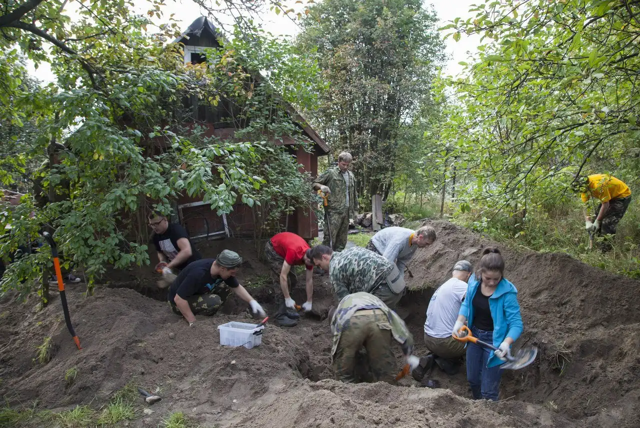 И вот у одного из ребят щуп ударился о кость. Расчищаем! Стало понятно, что солдат тут не один, пришлось расширять яму и убирать резиновые коврики, которые были выложены в качестве дорожки к берегу Невы. Ближе к бане, на глубине 20 сантиметров, показался козырек от каски.…В нем был череп. Мы даже замерли на несколько минут, настолько сильная была картина: пустые глазницы словно смотрели снизу вверх.