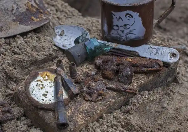 Большую часть дня мы копали на территории нашего лагеря и только к четырем часам добрались до участка на берегу. После двух часов поиска удалось обнаружить только солдатскую печку. Мы даже немного расстроились: подумали, что, наверное, здесь ничего нет. Но все же решили продолжить после обеда.