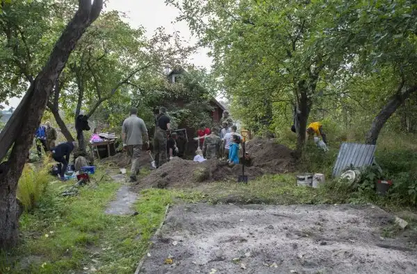 Увидели они жуткую картину: между яблонь проходила небольшая траншея, на дне которой, лежали останки четырех советских солдат.