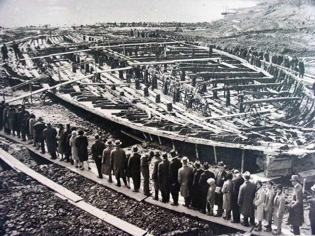 Очередь из желающих осмотреть реставрируемые останки судов Калигулы на берегу озера, 1932 год.