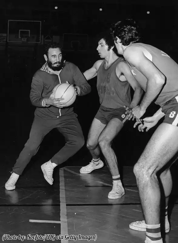 Кубинский лидер Фмдель Кастро играет в баскетбол с игроками краковского баскетбольного клуба "Висла"