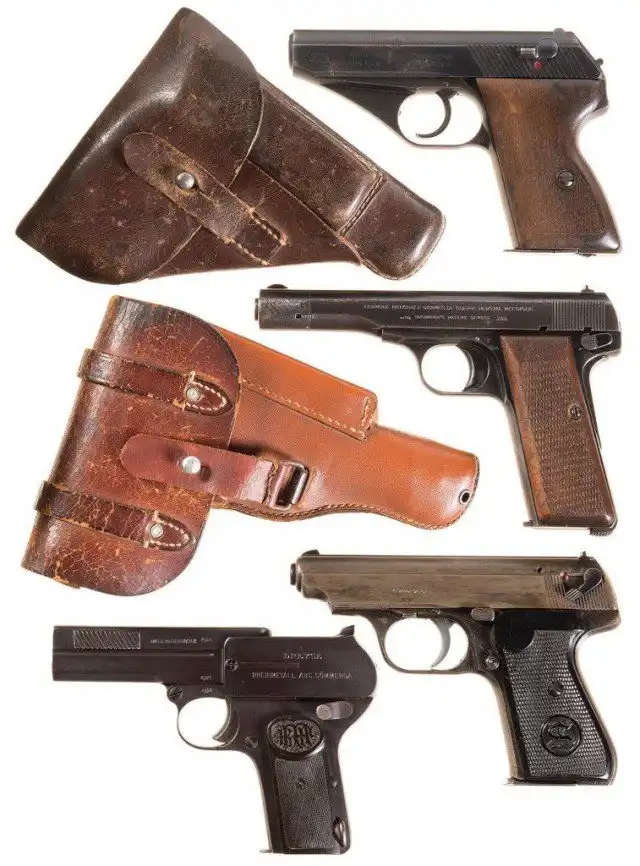 Чешский ČZ Model 1924 с нехарактерным для калибра 9x17 жёстким запиранием поворотом ствола при коротком ходе вместо традиционного затвора и чешский же карманный Praga 1921 со складным спусковым крючком. Выемка в передней части затвора - для взведения пальцем той же руки, которая держит пистолет.