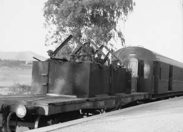 Британские солдаты на пулеметной бронеплощадке в составе пассажирского поезда. Палестина.