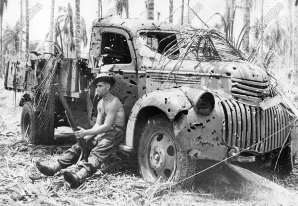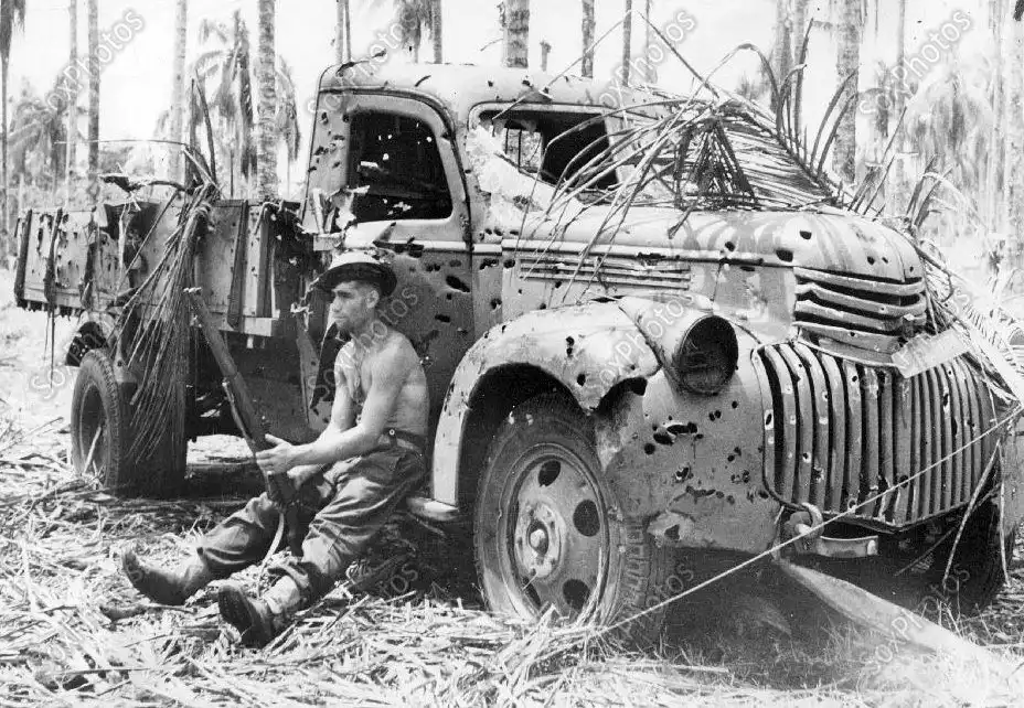 Австралиец отдыхает у изрешеченного японского грузовика Шевроле 1941. Папуа Новая Гвинея, 1943 год.