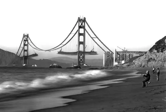 Мужчины рыбачат на фоне строящегося моста Золотые Ворота в Сан-Франциско,1930-е.