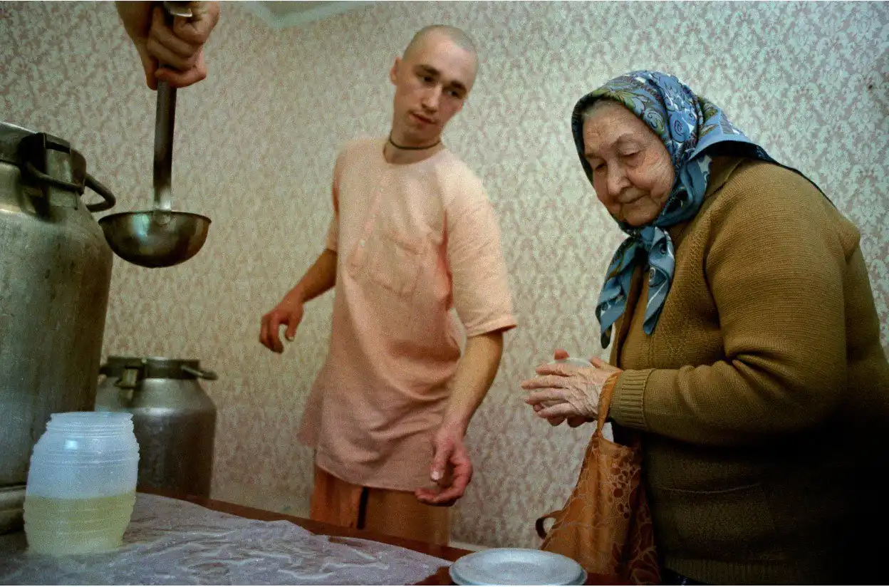 Пенсионерка получает еду в обмен на порцию песнопений в московском отделении секты Хара Кришны, 1993 год.