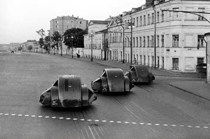 Подметально-уборочные машины (ПУ-7) на улицах Москвы, 1938 год.