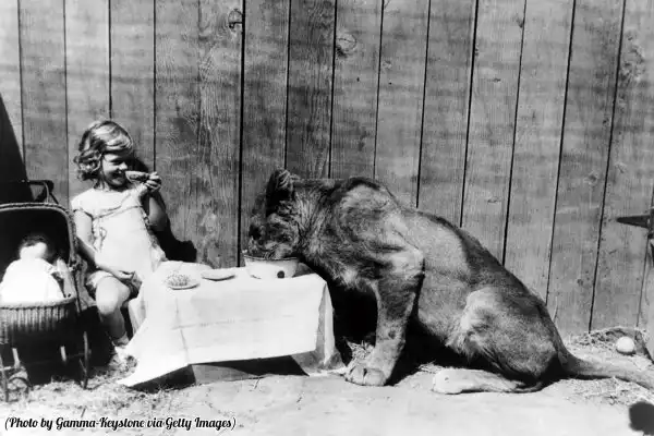 3-летняя Betty Bench пьет чай со своими куклами и львенком Nubia, Лос-Анджелес, 1930-е.