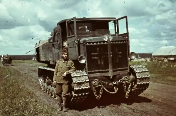 Венгерский солдат рядом с захваченным трактором "Сталинец", Восточный фронт.
