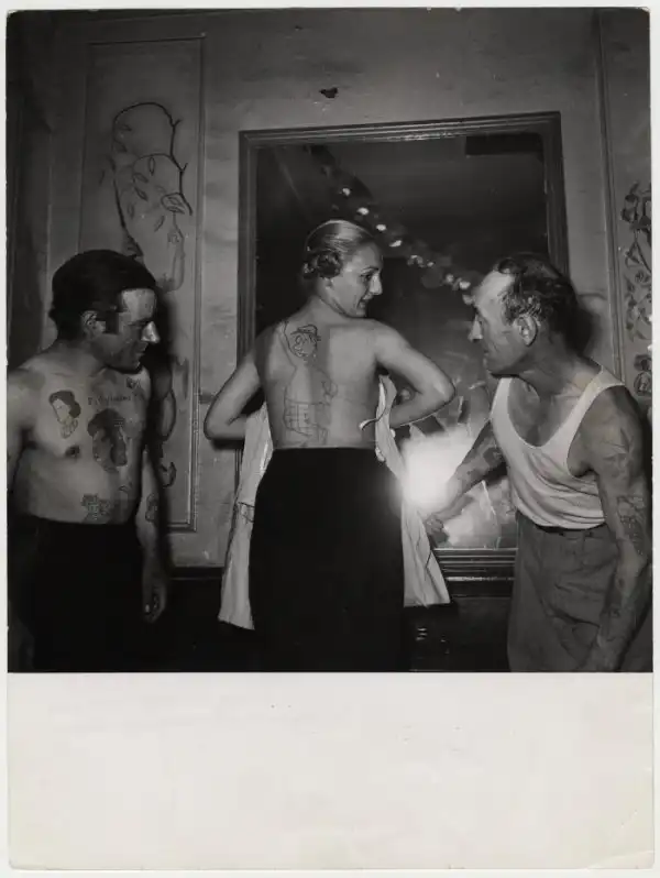 Конкурс тату в баре в улицы Муфтар, Во время конкурса женщина веселилась, представляя участникам поддельные татуировки, 1950 год.