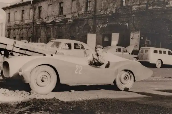 Самоделка, изготовленная в 1958 г. во втором ленинградском таксопарке Григорием Зининым и Валентином Капустиным. Судя по номеру 22, фотография сделана в том же году после чемпионата СССР, где Зинин с Капустиным заняли пятое место.