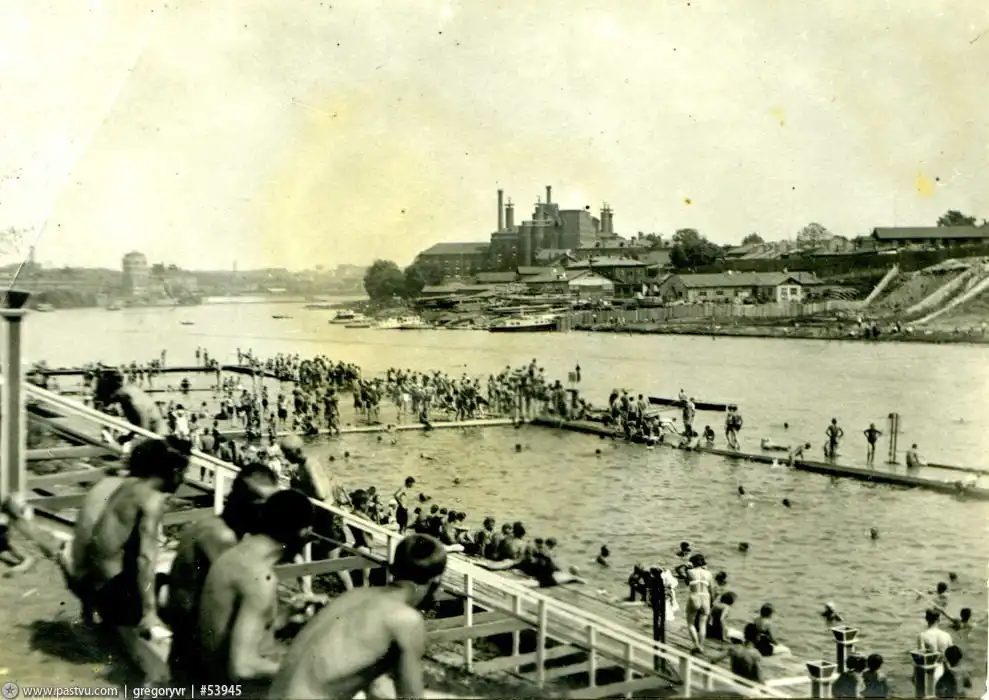 1933 год. Пляж Краснопресненского ЦПКиО выше Ермаковского ручья. Сейчас на этом месте — пристань Экспоцентр. На противоположном берегу видны трубы Бадаевского пивзавода.