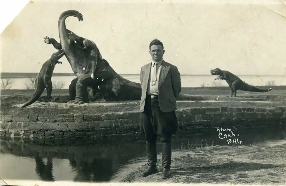 Скульптурная группа Борьба бронтозавра с цератозаврами изготовлена в 1932 году. Скульптуру создал евпаторийский мастер А.С. Лихошерстов.