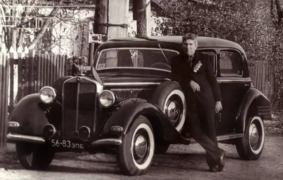 Машинист паровоза Иван Иванович Тимченко с Запорожстали со своим автомобилем Mercedes-Benz 230 sedan (W143).