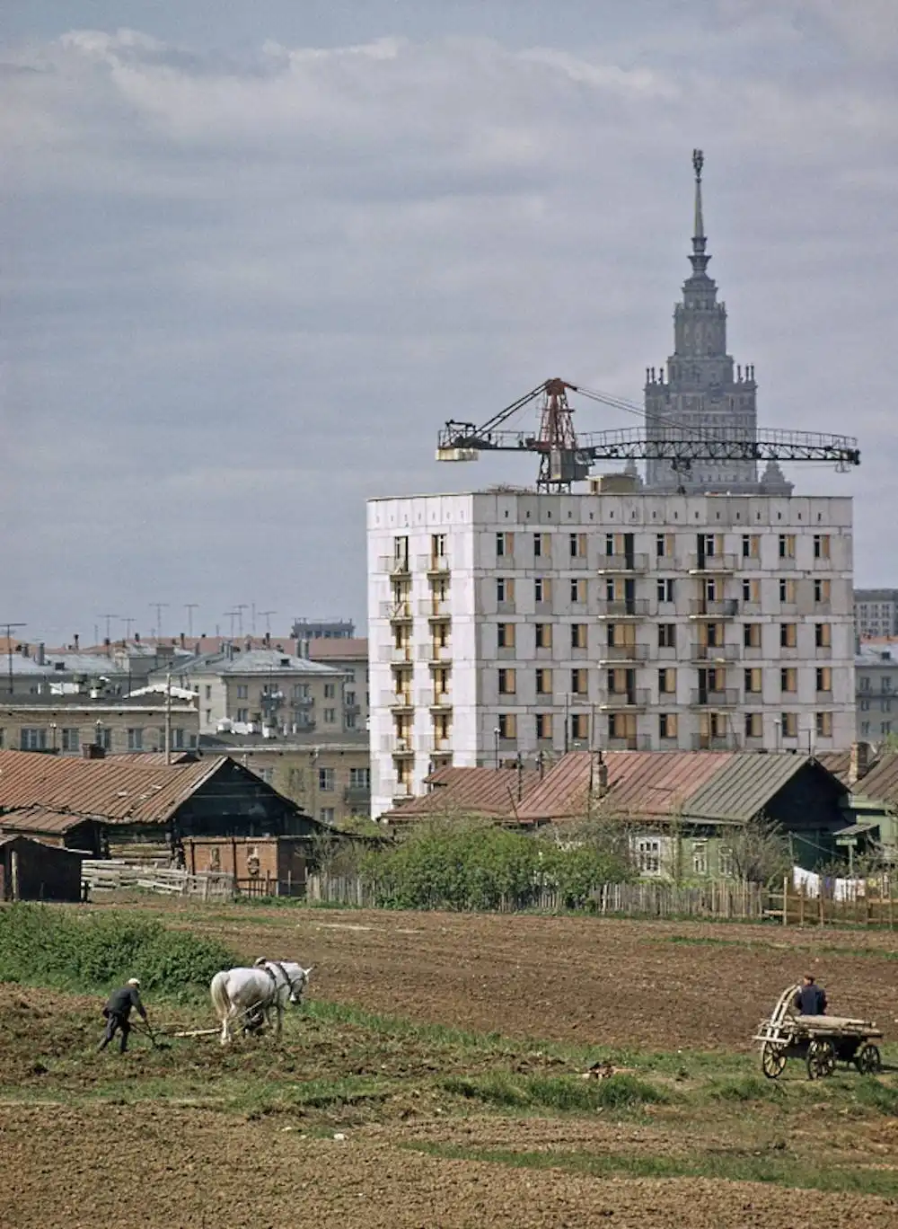 Москва деревенская, 1965 год. Землепашцы деревни Семёновское на фоне новостроек улицы Архитектора Власова.