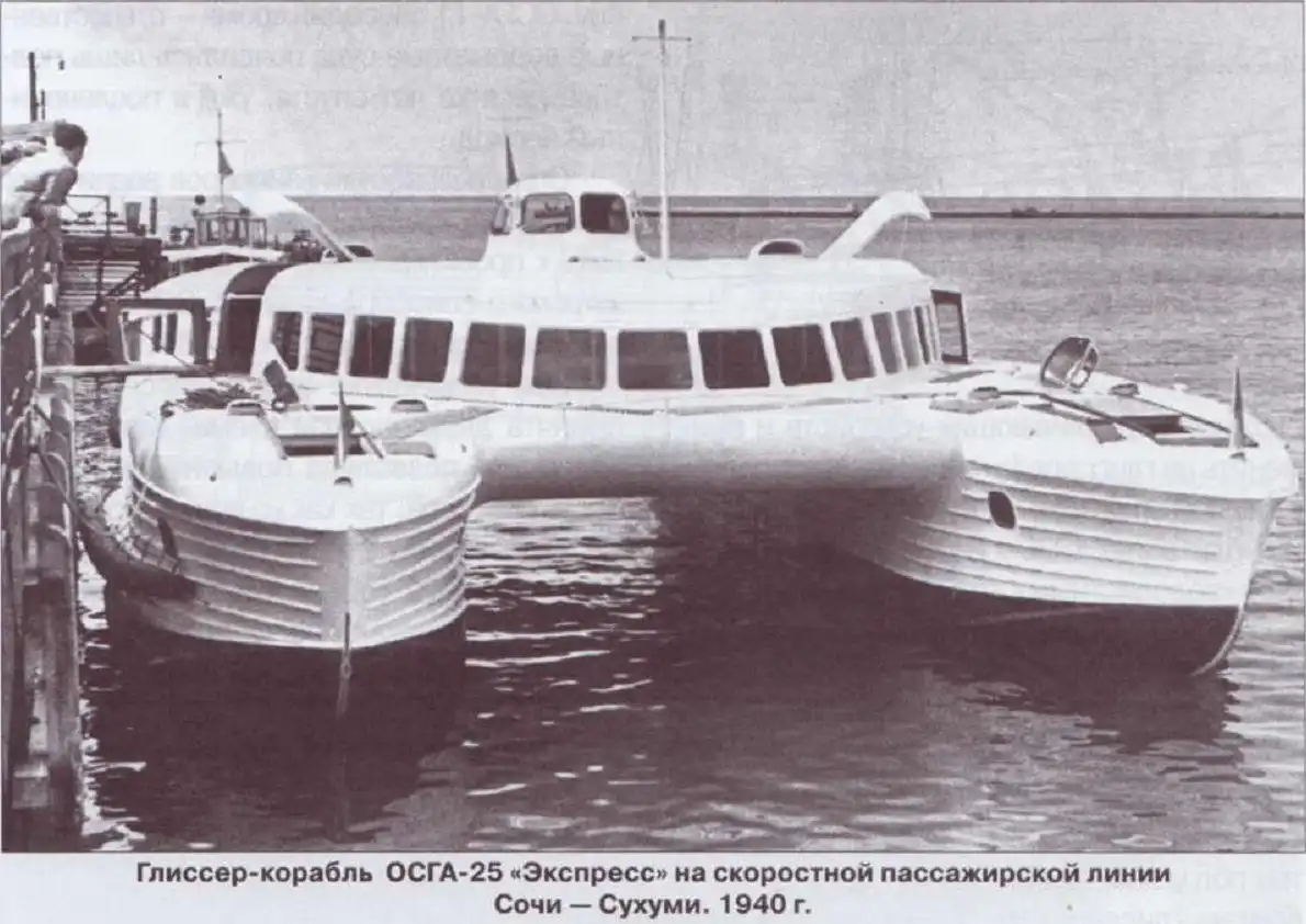 Крупнейший советский глиссирующий морской катамаран Экспресс. Забытый герой. Построен в 1938-1939 годах. Его наибольшая длина — 24 м, наибольшая ширина — 11,2 м, мощность четырех двигателей — 3000 л. с., полный вес — 46 т, наибольшая скорость хода — 86 км/час.