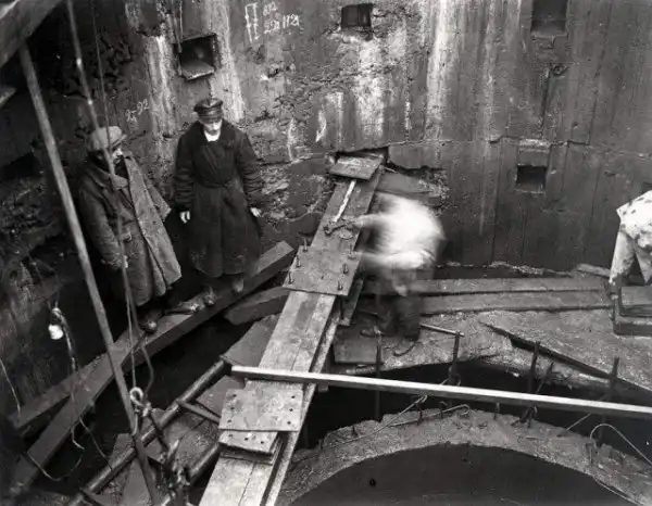 Строительство 1 очереди Московского метрополитена. Стяжка пакета двутавровых балок расстрела, 1930 год.