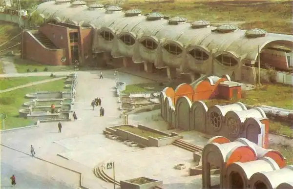 Советский Постмодернизм. Станция скоростного трамвая Имени Гутовского (ранее — Октябрьская). Архитекторы: неизвестны. Кривой Рог, Украина. Год постройки: 1986.