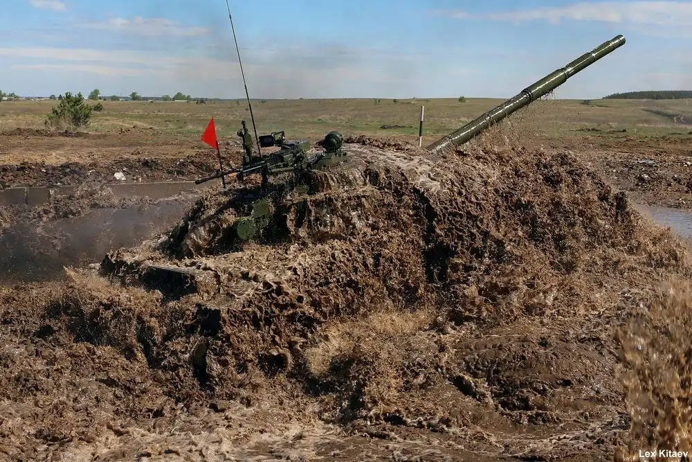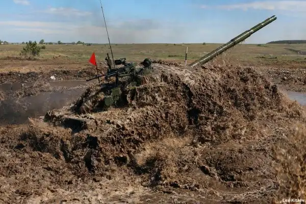Танк Т-72Б3 7-й отдельной гвардейской Оренбургского казачества Краснознамённой, орденов Суворова, Кутузова и Александра Невского танковой бригады преодолевает преграду.