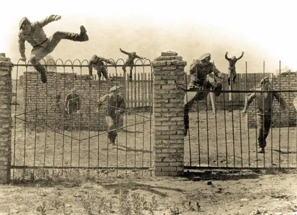 Бойцы 15-й отдельной бригады специального назначения ГРУ ГШ ВС СССР тренируются в преодолении различных препятствий.