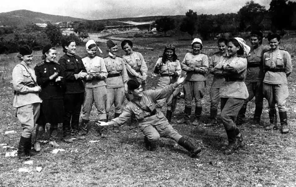 Пляшут штурман звена 46-го гвардейского Таманского Краснознамённого ордена Суворова III степени ночного бомбардировочного авиационного полка Нина Данилова и штурман эскадрильи того же полка