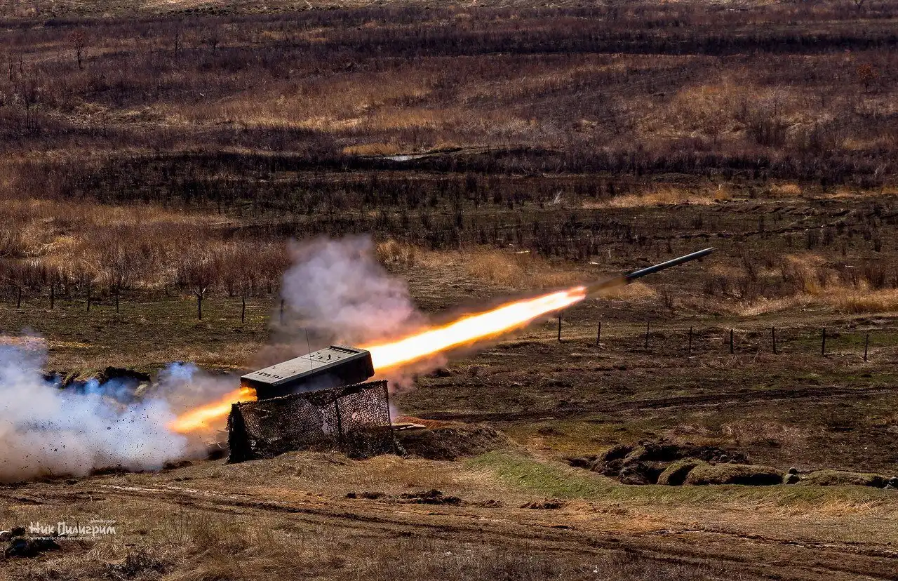ТОС-1А «Солнцепёк» 70-го отдельного огнемётного батальона ведёт огонь термобарическими снарядами по условному противнику. Восточный Военный округ РФ, апрель 2016 года.