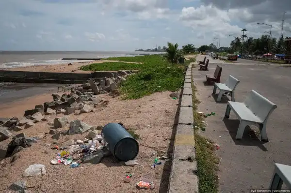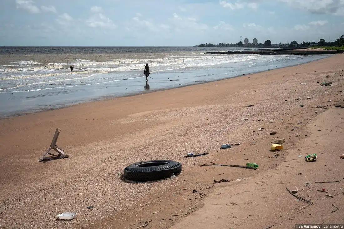 Пляж. Вода в море грязная, потому что Джорджтаун стоит в устье реки Демерара, которая выносит сюда всё говно. До ближайшего пляжа с чистым морем нужно ехать километров 20. А здесь в море никто не купается, и пляж завален покрышками, стульями, каким-то мусором.