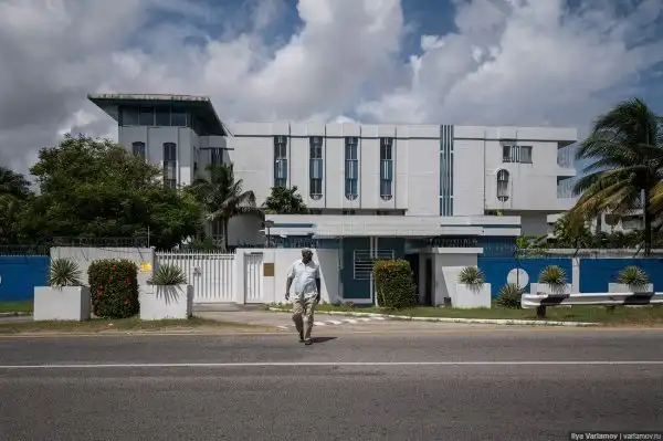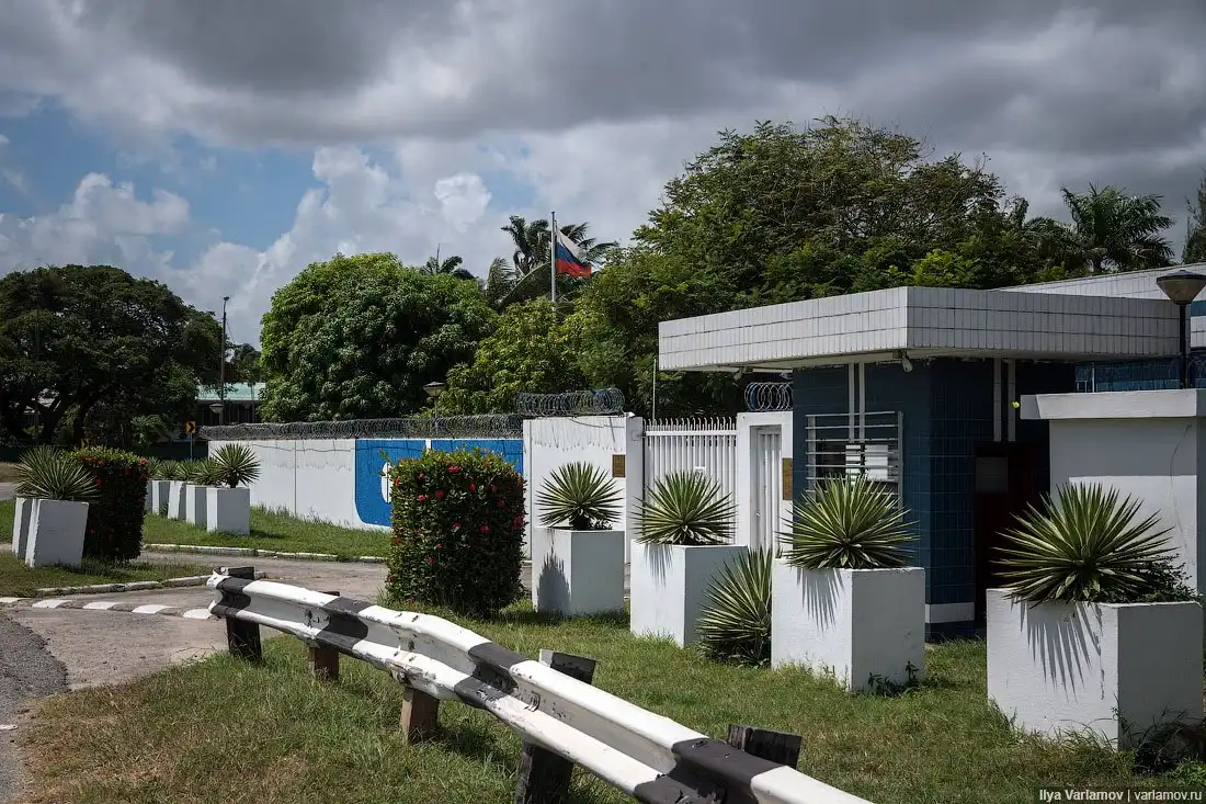 Здание, как и всё в Гайане, постепенно разваливается. Всё какое-то облупившееся, с какими-то подтёками. Российское посольство довольно органично смотрится среди общегайанской разрухи.