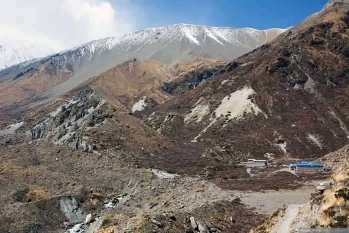 Вдалеке виднеется базовый лагерь. Впечатление, что до него рукой подать обманчиво. Тропинка не прямая, она то резко опускается, то резко поднимается, словно усмехаясь над изрядно уставшими путниками. К этому моменту мои ноги уже были ватными — бесконечное петляние и борьба с равновесием отняло много сил. Да и что тут говорить, сейчас я уже превысил отметку в 4 000 метров, и отныне ниже мы уже не опустимся в ближайшую неделю. Этот трек необходим ещё и для того, чтобы заночевать на высоте 4000+ метров — это поможет лучше подготовиться к перевалу Торонг Ла. Хотя, конечно, богатырским такой сон никак не назовешь, скорее одним из очередных мучений.