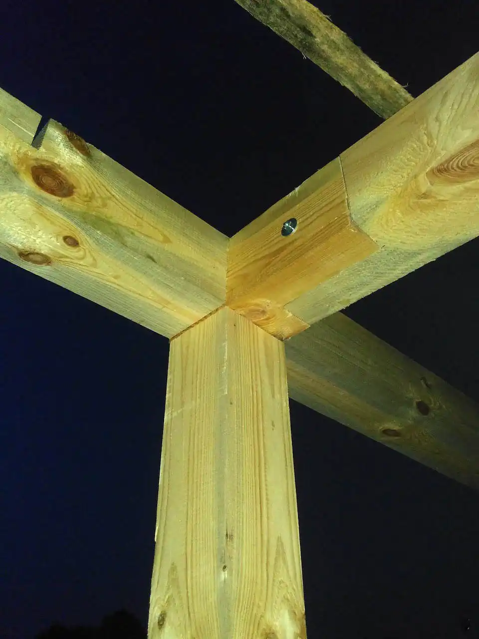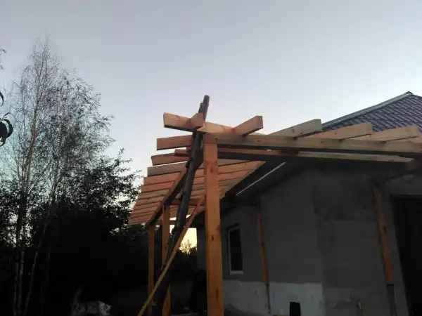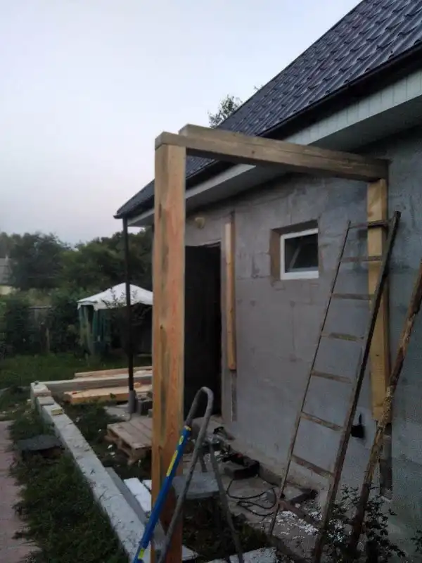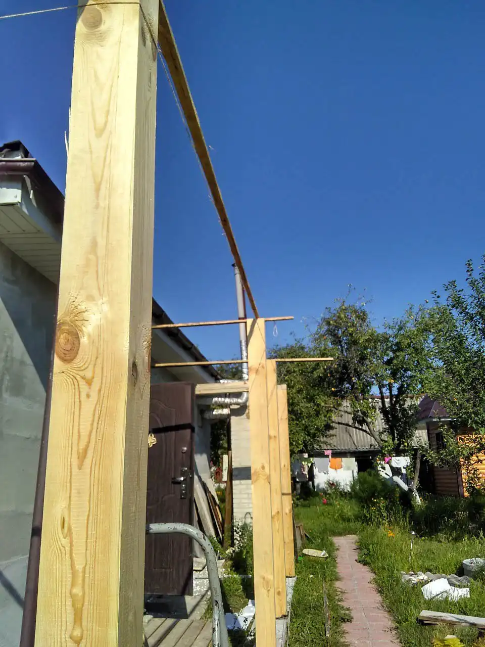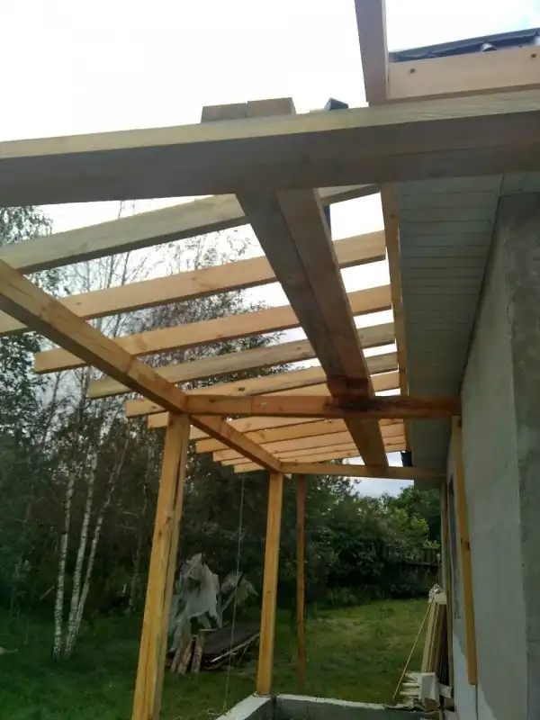 Столбы 140*140, лаги 200*60, фальш-столб (на стену) и стропила 140*70 =180$